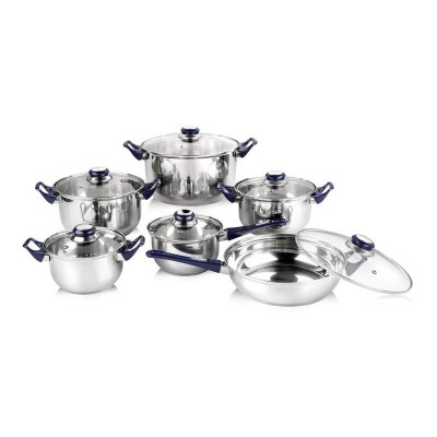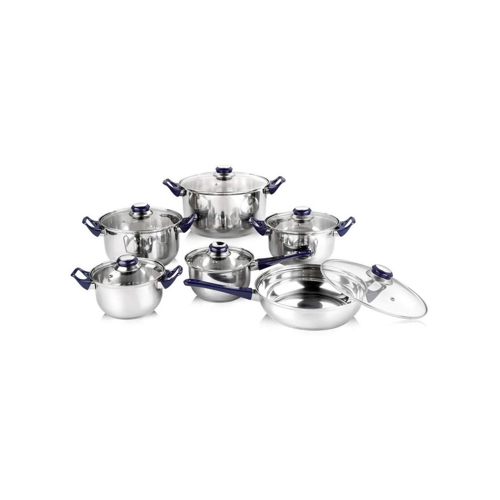 12-piece set of stainless steel utensils CELESTE contains: saucepan 13.5 x 7 cm, pot 15 x 8 cm, pot 15 x 8 cm, pot 17 x 9.5 cm, pot 21 x 11.5 cm, pan 21 x 6 cm. The pots, pans and pans have clear glass lids with plastic handles. The pots can be used on all types of hobs except induction (the bottom does not contain a protector for induction hobs).